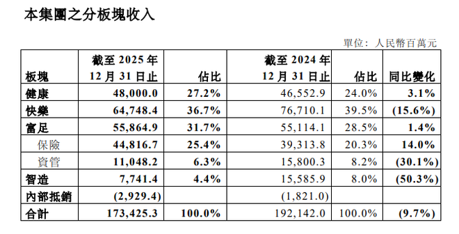 夿å½é ç主è¦ä¸å¡å为å¥åº·ãå¿«ä¹ãå¯è¶³ãæºé å大æ¿åï¼æ¶µçåå¤§æ ¸å¿ä¼ä¸ââ夿å»è¯ã豫åè¡ä»½ã夿è¡èçä¿é©åå¤ææ æã2025å¹´ï¼åå¤§æ ¸å¿ä¼ä¸æ»æ¶å ¥è¾¾å°1282.4亿å ï¼å æ»æ¶å ¥æ¯éè¾¾å°74%ï¼åé¤è±«åè¡ä»½å½±åï¼æ¶å ¥åæ¯ä¸å3%ã