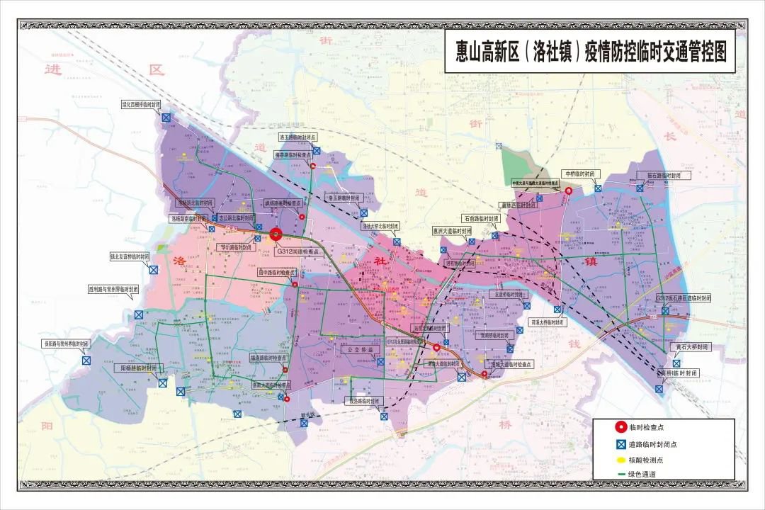 惠山高新区洛社镇也发布了临时交通管制通告,自即日起,对进出区域的全部出入口进行管控。他们特意发布了疫情防控临时交通管控图,用以方便居民查看哪些道路可通行哪些不可通行。